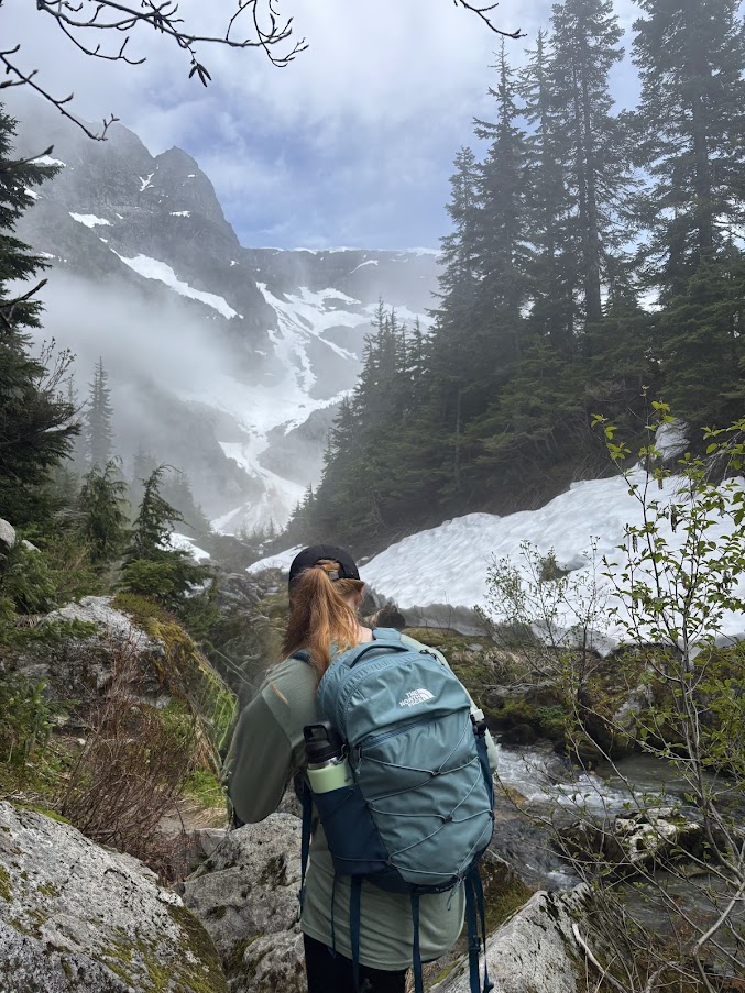 Just as we arrived, the clouds lifted and blue skies appeared. Seeing the mountains from a closer perspective was incredible. We could see our tent looking out over the lake, and also where we had turned back on our earlier hike across the water. To get to Niobe Meadows from here, you essentially just scale the waterfall that flows down into the lake. It was a really fun scramble and as soon as we got to the meadows, the clouds once again dispersed and we could see Mount Niobe in all its glory.