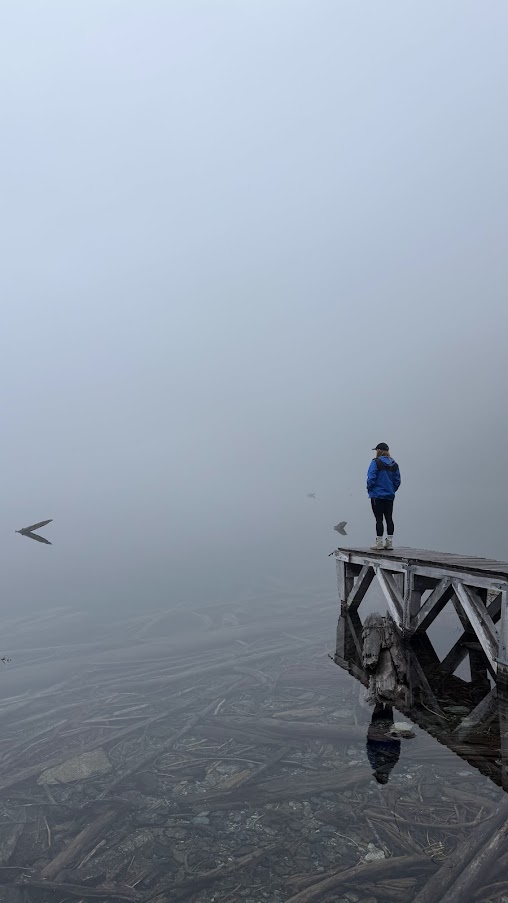 We attempted to hike the 3km trail to Lambda Lake which involved walking along the edge of the lake, scaling the large rocks and venturing back into the trees along some extremely narrow paths with some pretty sheer drops. About a kilometer in (although it felt way longer due to the constant climbing up and down), we arrived at a steep, sketchy looking section with chains that was blocked by a huge pile of snow that was too risky to cross. The clouds were also completely blocking our view so we thought it wasn’t worth carrying on. We decided to turn back to camp for some lunch and attempt the hike in the opposite direction to Niobe Meadows instead.