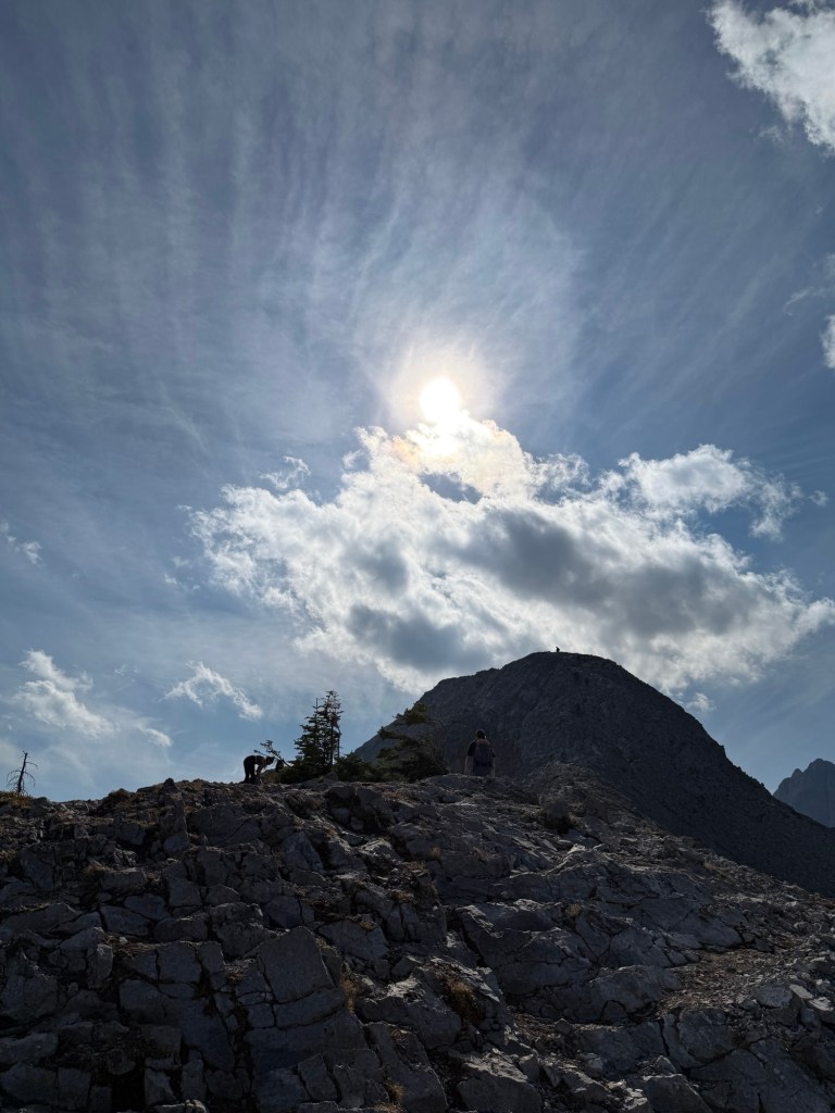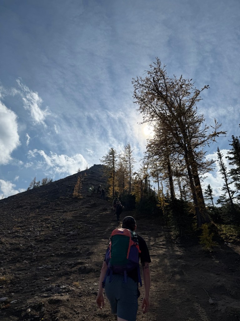 By beginning at this trailhead, the trail takes you through a forest for some time before opening up into a meadow of larches. We could see the outlines of other hikers all along the top of the mountains that surrounded the meadow and realized that’s where we were going to be hiking which was so exciting! Usually, you just climb to the top of the mountain and that’s that, you relax and take in the view before heading back down. Whereas this time, the majority of the hike is trailing across the mountain’s ridges from one side all the way across to the other.