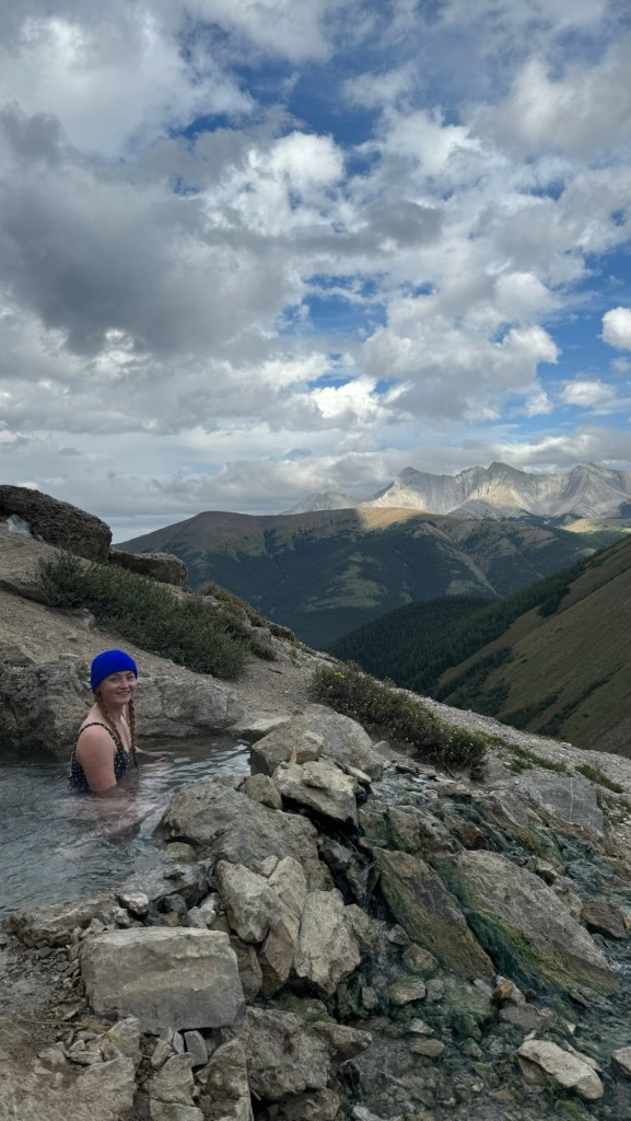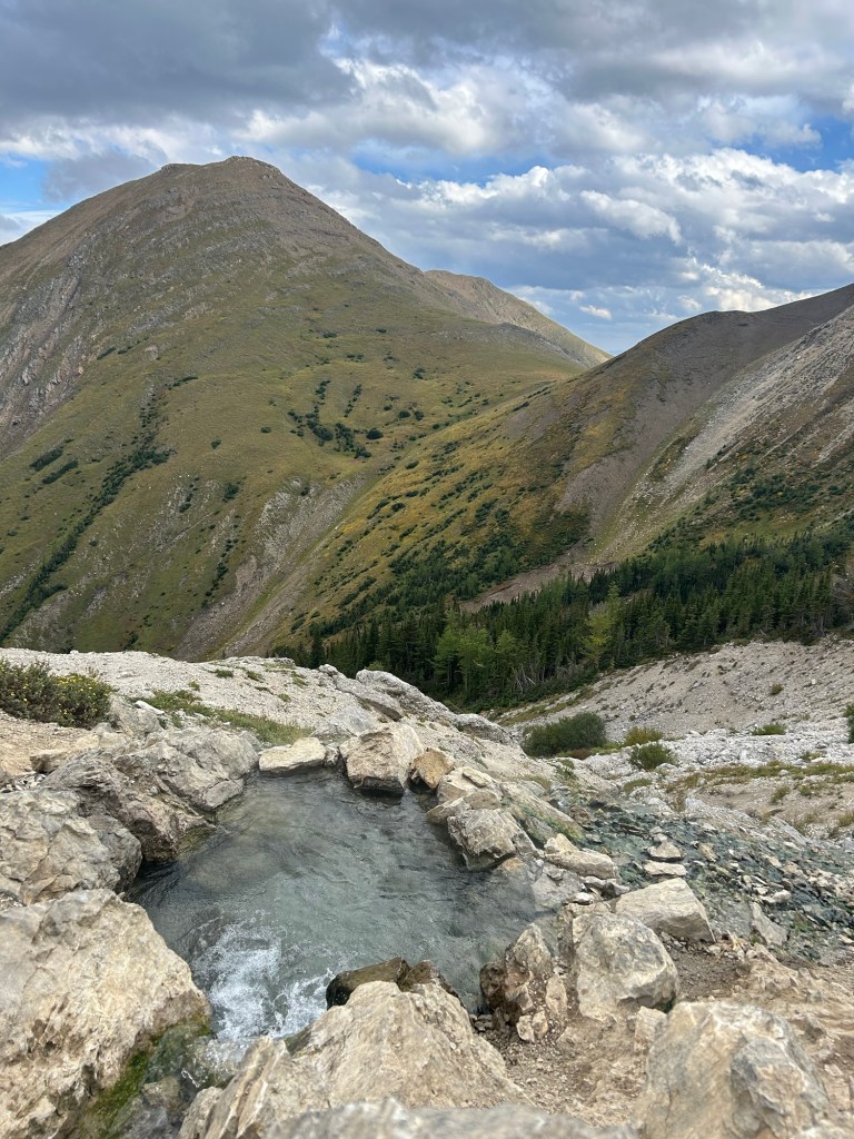 I would definitely recommend this hike but only if it wasn’t busy. We arrived at the hot springs at 5:00 PM and it was a very rainy day in Banff which is why we headed toward Kananaskis. The weather wasn’t perfect but the rain held off and the blue sky was trying it’s best to break through the clouds. Honestly, a cooler, stormy day is much better suited to this hike than a hot summer’s day. You’ll appreciate the subtle warmth of the hot springs even more!