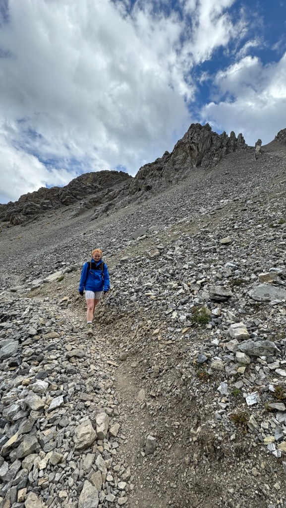 The trail begins through a forest and it gets progressively steeper. It definitely requires effort and would be challenging for beginners. The trail then opens up into a gorgeous meadow with lush green grass and fir trees. You continue to climb uphill until getting to the top and then you’ll see the unnerving loose scree and narrow trail that awaits! When I got to the top of the hill and looked at the surrounding mountains and trees, I genuinely felt so content to be there in that moment. It was breathtaking scenery and really reminded me of the German Alps.